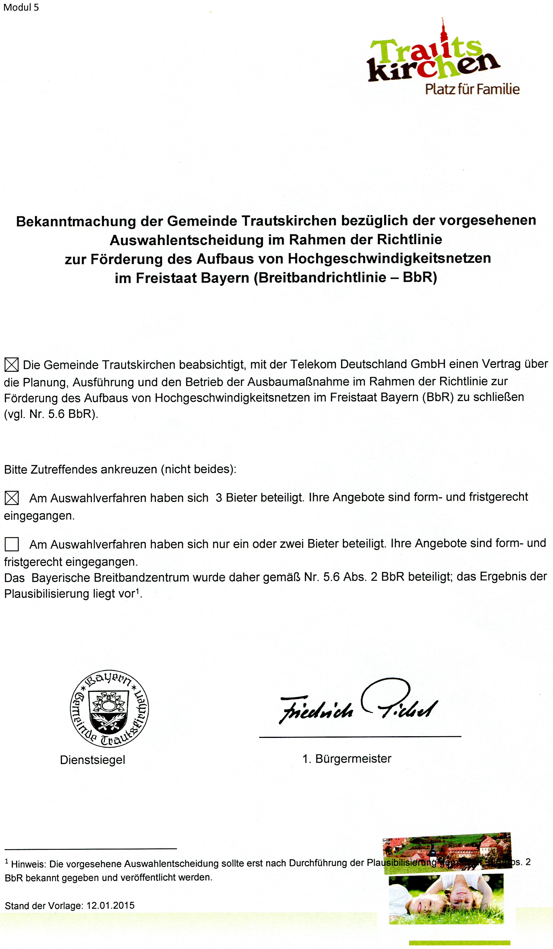 Auf Grundlage des Gemeinderatsbeschlusses vom 18.09.2015 beabsichtigt die Gemeinde Trautskirchen einen Kooperationsvertrag mit der Telekom Deutschland GmbH abzuschließen.